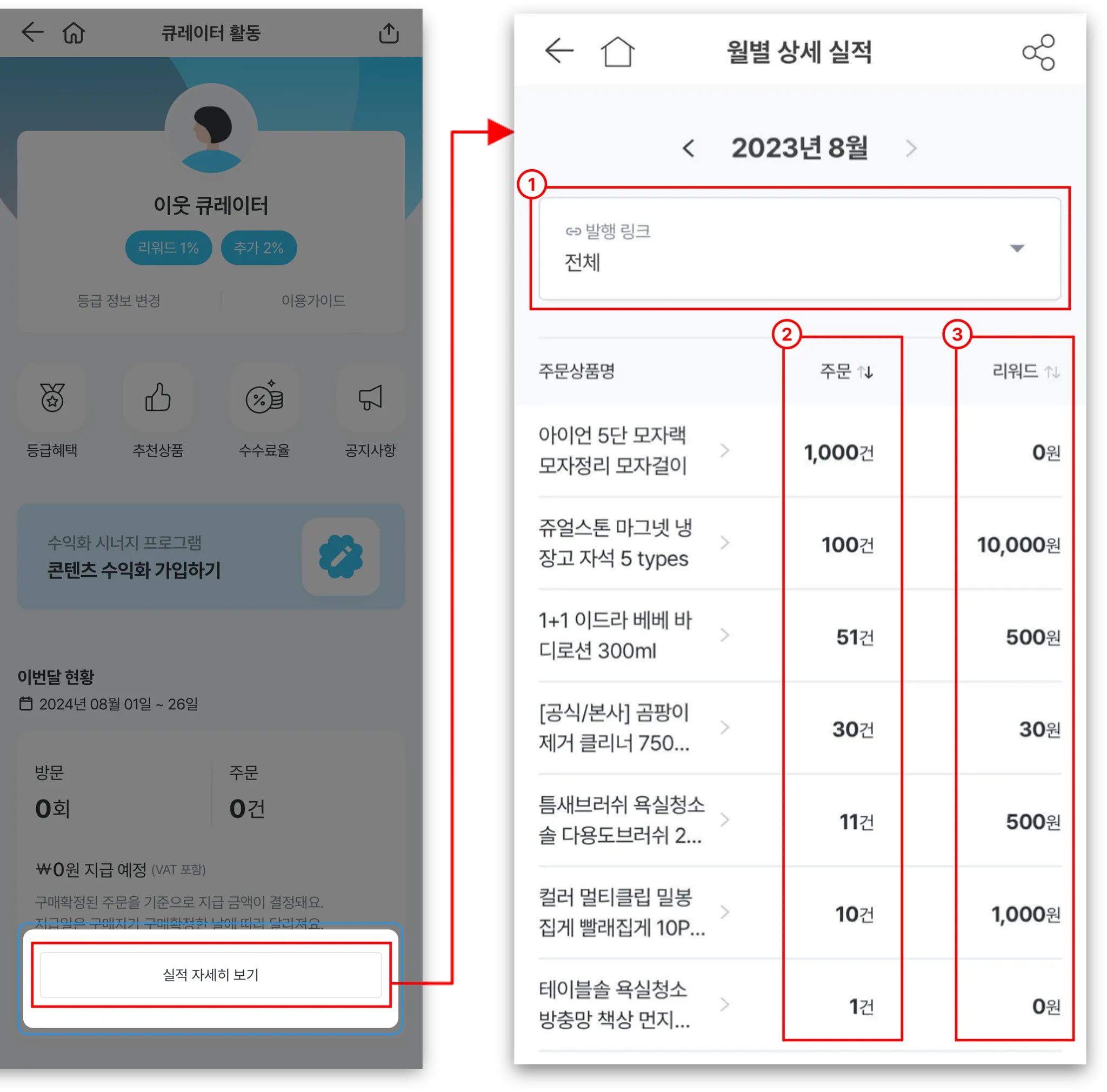 특정 링크 선택 시 : 해당 링크의 주문 및 리워드만 특정하여 확인 가능