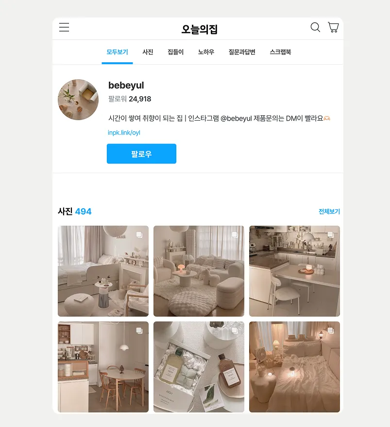 현재 오늘의집 팔로워는 2만 명이 넘었어요. 인스타그램과는 채널 특성이 다르다 보니, 사진을 고르고 올리는 방식도 조금 달라요. 인스타그램에서는 제품/공간/소품 연출 등 다양한 사진을 올리지만, 오늘의집에는 공간 전체가 잘 보이는 사진 위주로 올려요. 구조나 가구 배치가 한눈에 보이는 사진이 참고하기 좋더라고요. 그리고 사진 속 상품을 최대한 많이 태그하려고 해요. 아시겠지만 스타일링샷은 리뷰보다 더 먼저 보여지는 사진이라 눈길을 끌기 좋은 것 같아요.