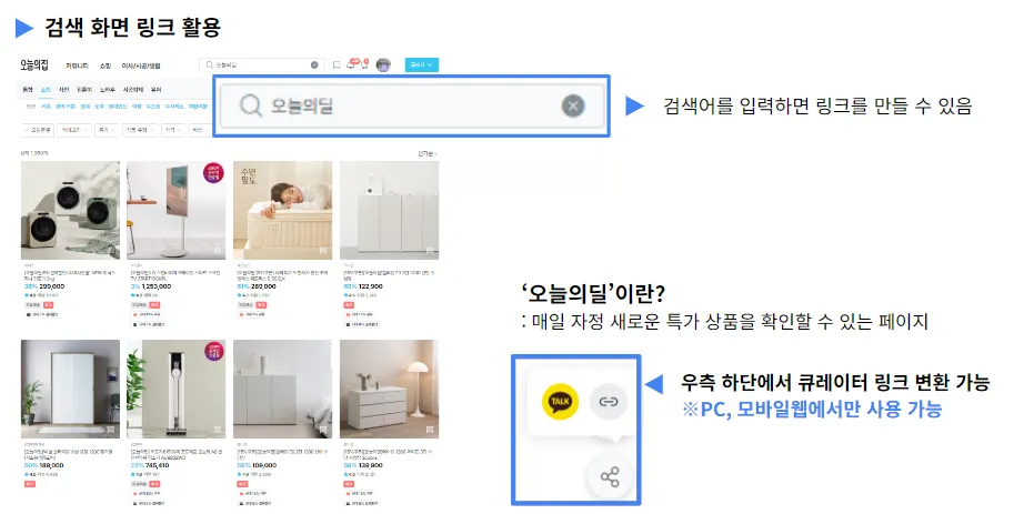 검색창에 ‘오늘의딜’을 검색한 화면을 링크로 발행하여 특가 페이지 링크로 공유하는 등 다양하게 활용할 수 있어요.